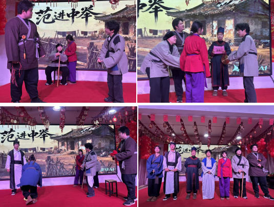 晚会在气势恢宏的大合唱《仲景少年正气歌》中拉开序幕,歌声铿锵,展现了学子们秉承医道、正气凛然的风骨。随后,节目精彩纷呈,形式多样:太极表演《太极流转・草木清宁》将中医养生理念与柔中带刚的拳法相融合,意境幽远;小品《本草芳华》以幽默生动的方式演绎中药文化,引得全场笑声不断;而改编小品《范进中举》则在经典中注入时代思考,展现了学子们的人文情怀。